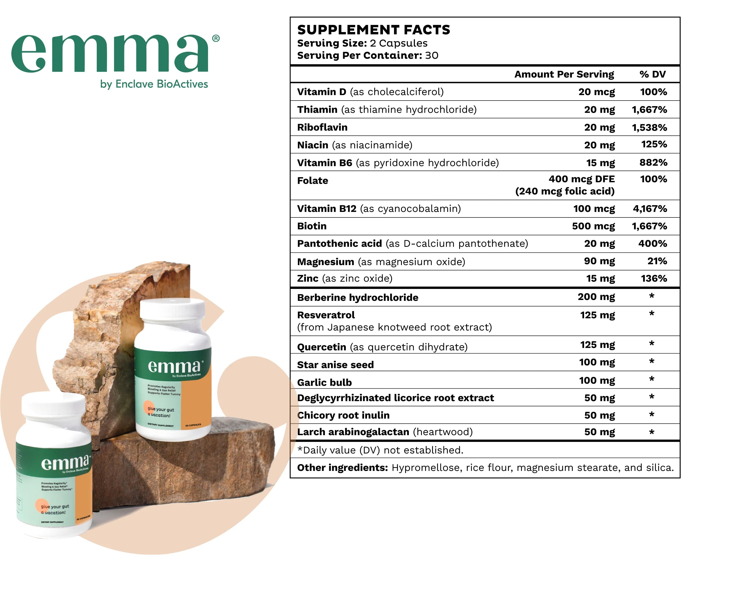Emma is a science-backed breakthrough formula that targets digestion-slowing bacteria and microbiome imbalances, helping reduce bloating, gas, and constipation while providing gentle relief from common gut health issues. We believe the digestive system is both complex and sensitive — which is why Emma is designed to be gentle, effective, and powerful.